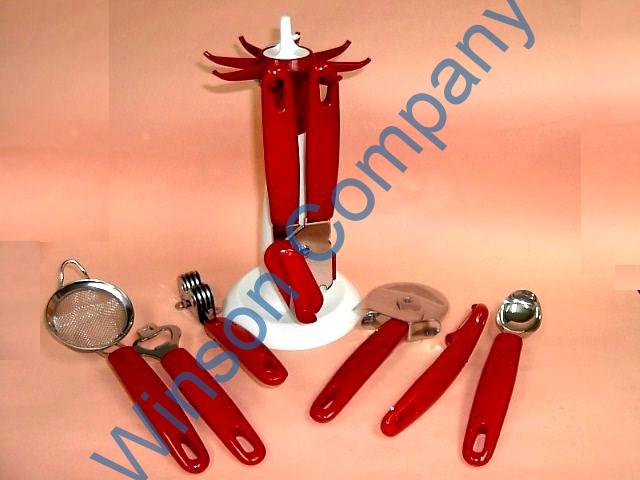 KN6195 Gadgets set of 7 pcs incl.: bottle/can opener pizza cutter mesh strainer peeler knife sharpener bottle opener ice cream scoop & revolving stand.