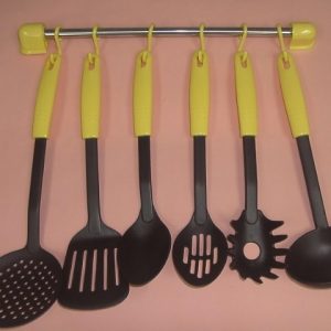 - KN6210 Tools set of 7 pcs incl.: slotted turner slotted spoon cooking spoon rice skimmer soup ladle spaghetti server & hanger with 6 plastic hooks. NL&PL