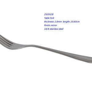 - 2505S28 Table fork thickness: 2.8mm length: 20.60cm finish: mirror 18/8 stainless steel
