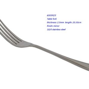 - 6005R25 Table fork thickness: 2.5mm length: 20.30cm finish: mirror 18/0 stainless steel